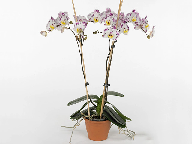 Фаленопсис "Floriclone Cupid Spirit" - это замечательный вид орхидеи, который привлекает внимание своими крупными цветками. Цветки этого растения имеют диаметр от 7,5 до 8 см и окрашены в белый цвет с множеством разноцветных прожилок, создающих эффект перьев. Такое разнообразие цветов делает цветы этого фаленопсиса по-настоящему удивительными и привлекательными для любителей экзотических растений.