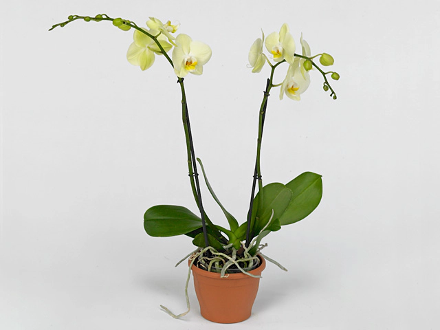 Фаленопсис "Mira" - это красивый и изящный вид орхидеи, обладающий своими особыми характеристиками. Цветок данного вида имеет желто-светло-желтый оттенок, диаметр которого составляет около 9-9,5 см. Растение достигает высоты от 50 до 60 см, листья имеют продолговатую форму и размер от 20 до 25 см. Величина соцветия составляет от 20 до 25 см. Основной цвет листьев - темно-зеленый, а у губы (lip) преобладает зелено-средне-желтый оттенок. Кроме того, на губе также можно наблюдать вторичные цвета - белый и коричнево-оранжевый.