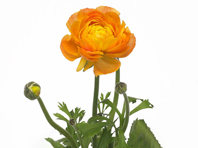 Ранункулюс азиатский "Amandine Orange" - это вид крупного многолетнего травянистого растения, отличающегося прекрасными двойными цветками с ярким оттенком. Это растение привлекает внимание своими изысканными цветками, которые могут быть окрашены в желтый, средний желтый или оранжевый. Цветки имеют диаметр от 6 до 6,5 см, что делает их очень заметными и привлекательными.