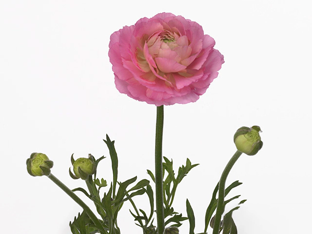 Листья этого растения имеют зазубренные края и делятся на лопатки, что придает им оригинальный вид. Они имеют средне-зеленый оттенок и прекрасно конрастируют с нежными цветами ранункулюса "Glamorous Pink".