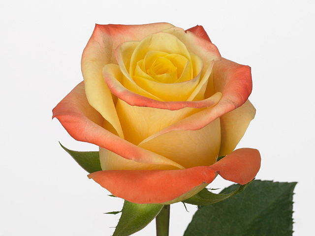 Роза крупноцветковая "Florida" представляет собой растение с ярко-оранжевыми и желтыми цветами, диаметр которых составляет 8-8,5 см. Цветение происходит в виде одиночных цветков, которые окрашены в несколько оттенков: от оранжево-красного до светло-розового. Основной цвет листьев темно-зеленый.