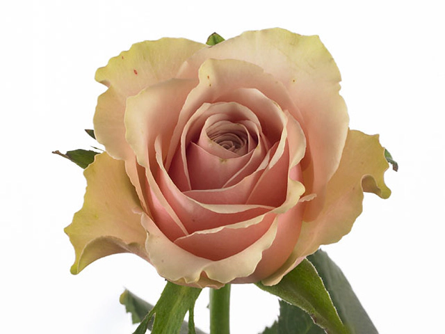 Листья растения имеют зазубренную кайму, что добавляет им декоративности. Они имеют различные оттенки зеленого цвета, что придает розе дополнительный интерес. Сам цветок обладает диаметром от 8,5 до 9 см, что делает его очень крупным и видным. Он имеет розово-голубой оттенок, что делает его весьма необычным и привлекательным.