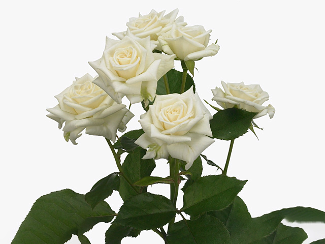 Листья растения имеют темно-зеленый оттенок, что является типичным для большинства роз. Это отлично сочетается с белыми цветами розы и создает контрастный и яркий образ.