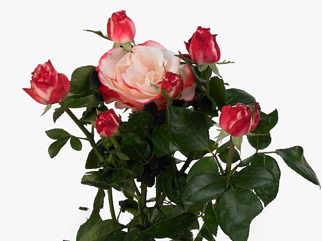 Описание цветов этого сорта розы впечатляет. Они достаточно крупные, с диаметром от 8,5 до 9 см. Цветки обладают многотонной расцветкой – от красного и темно-красного до белого. Наличие розово-фиолетовых оттенков делает их еще более привлекательными. Они одиночные, то есть каждый цветок распускается на отдельной стебле, что придает растению еще большую изящность.