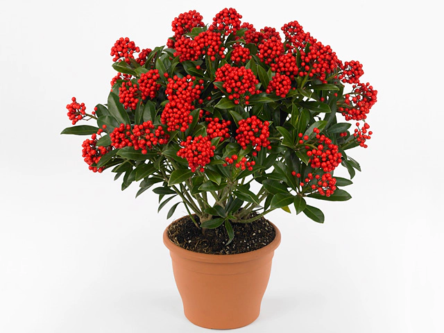 Время цветения скиммии "Pabella" - с января по апрель и с октября по декабрь. Цветение этого растения – это также один из его привлекательных аспектов, когда ярко-красные ягоды украшают кустарник.