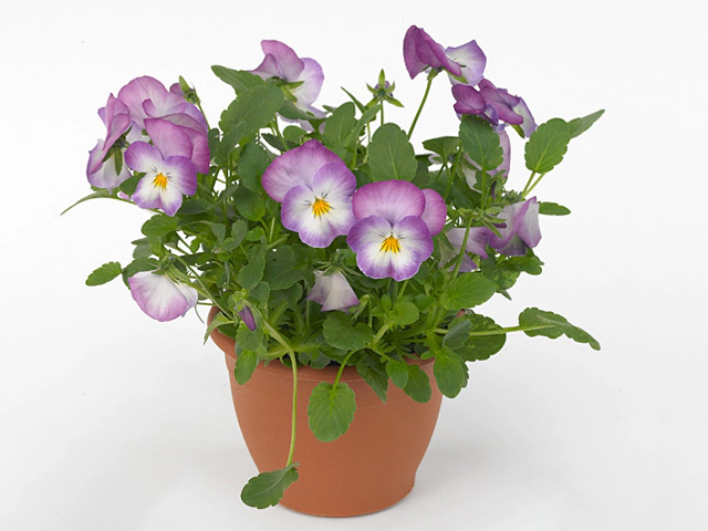 Фиалка рогатая "Deltini Rose Pink" - это прекрасное растение с яркими и красивыми цветами. Ее цветки имеют фиолетовый-средний фиолетовый оттенок с белыми полосами. Диаметр цветка составляет от 3,5 до 4 см, а высота растения - от 5 до 10 см. Листья имеют овальную форму и темно-зеленый оттенок, их размер составляет от 2 до 3 см.